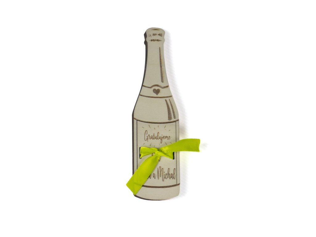 Personalizovaný dřevěný dárek ve tvaru šampaňského – Gratulace a místo pro peníze nebo dárek